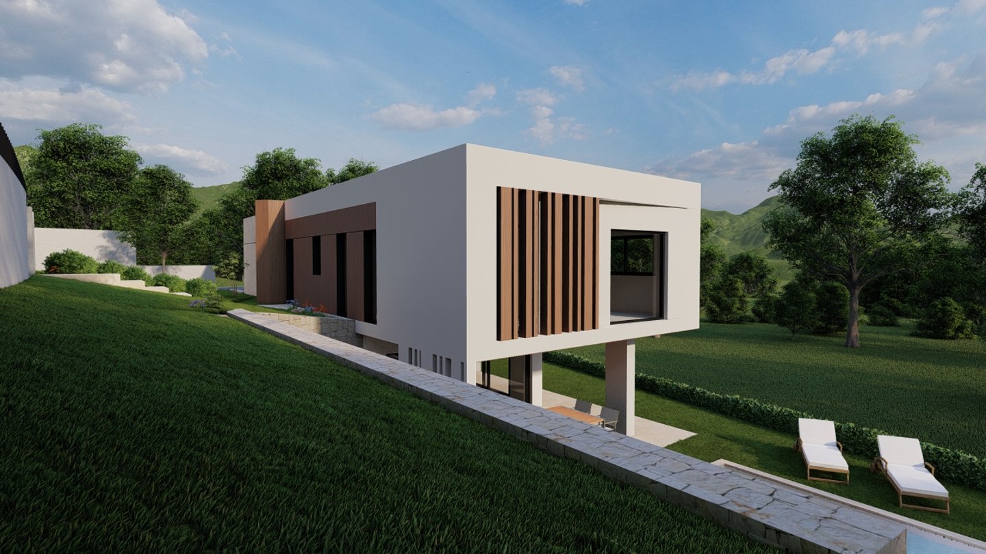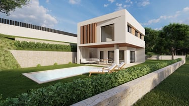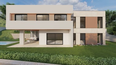 Vivienda de 180 m2 construidos en dos plantas acabada en Sate blanco y nuestro característico alistonado de madera.